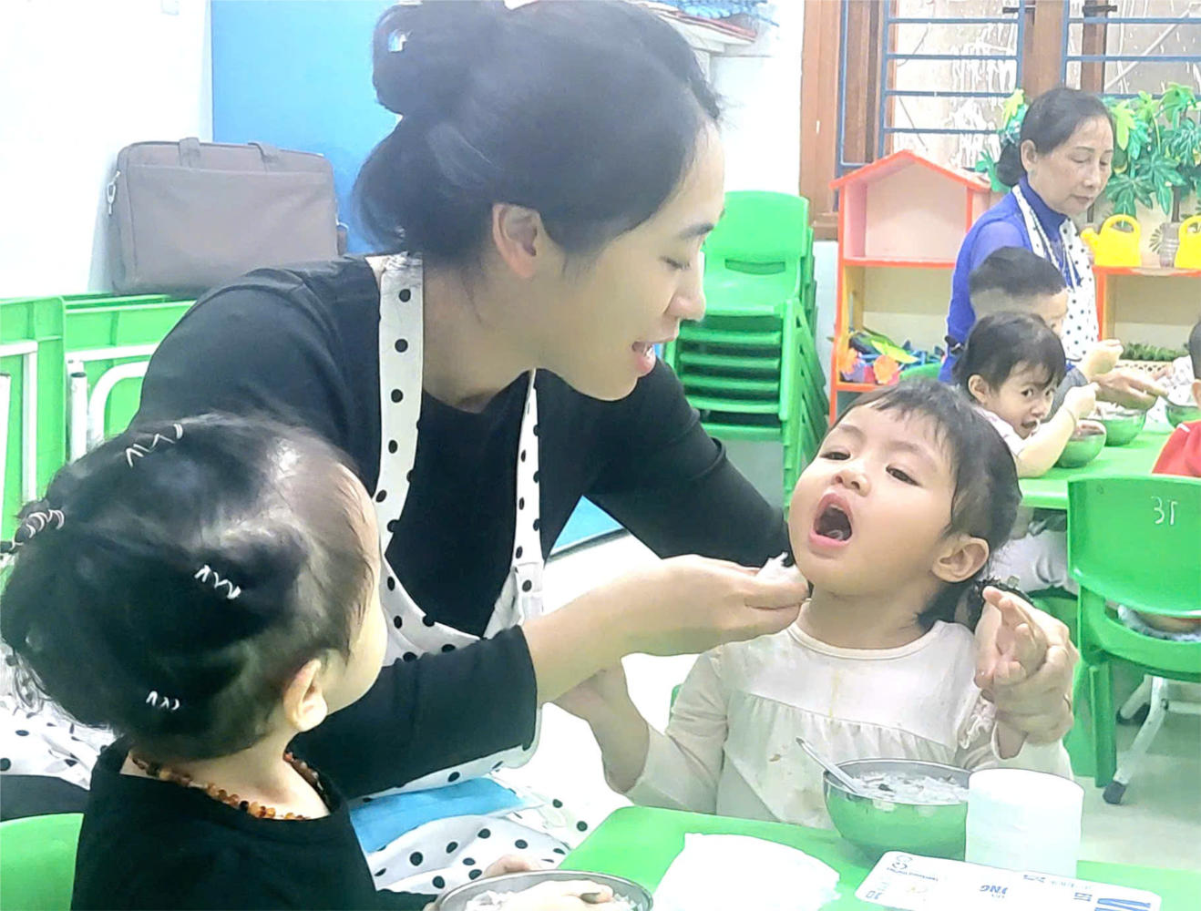 lại vừa phải xử lý tranh chấp đồ chơi – điều mà các cô vẫn làm mỗi ngày với sự bình tĩnh đáng khâm phục.