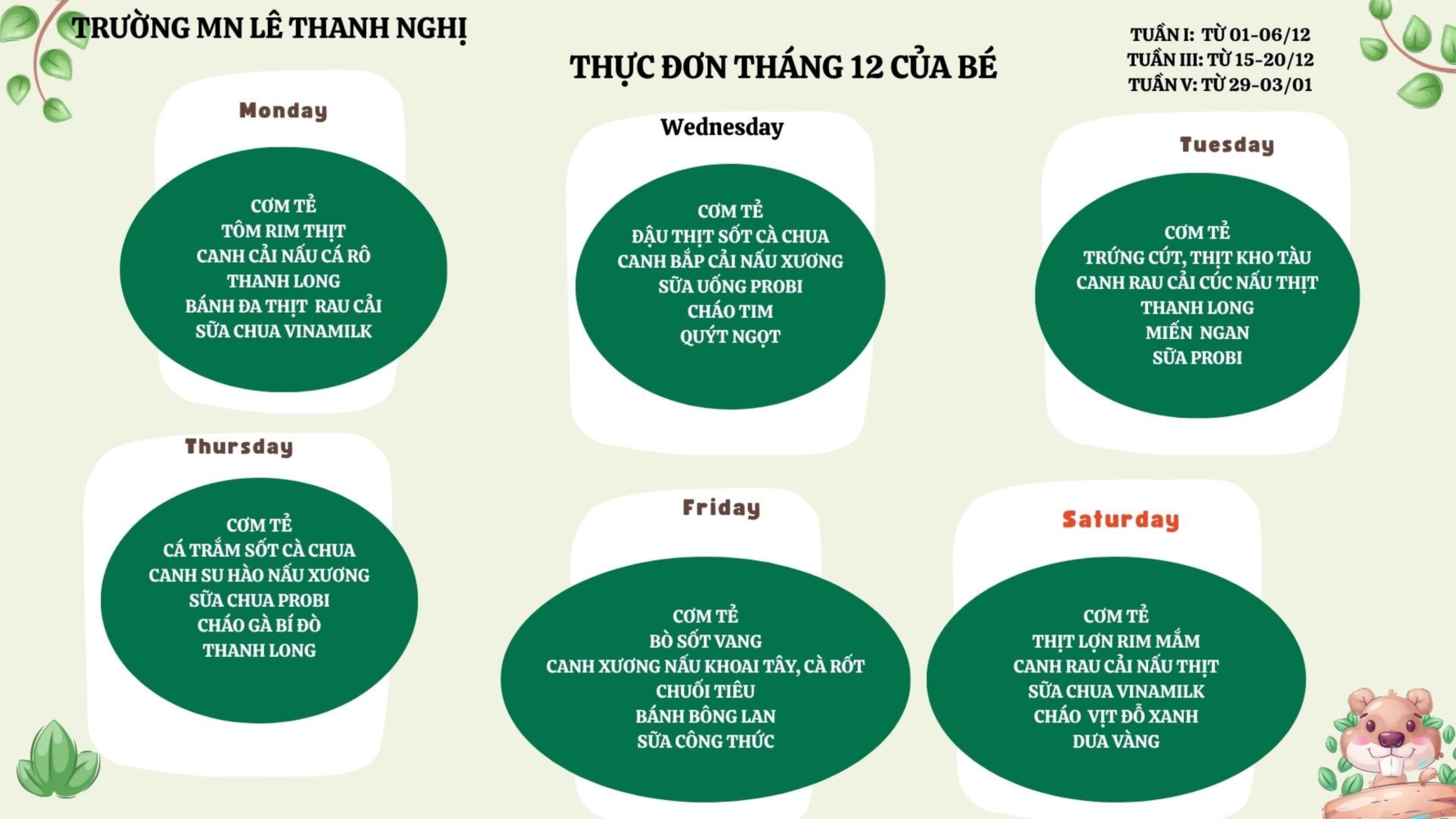👉 Kính mời quý phụ huynh theo dõi chi tiết thực đơn trên bảng niêm yết và hệ thống truyền thông của nhà trường.